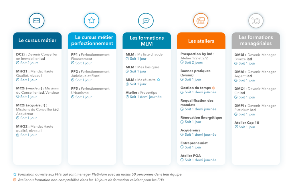Chez iad, nos conseillers* bénéficient d’un parcours de formation unique développé par des professionnels du secteur. Ces formations peuvent se réaliser en e-learning via l’Université en ligne, et en présentiel au sein des pôles de formation iad partout en France, via plus de 600 coordinateurs de formation habilités.
