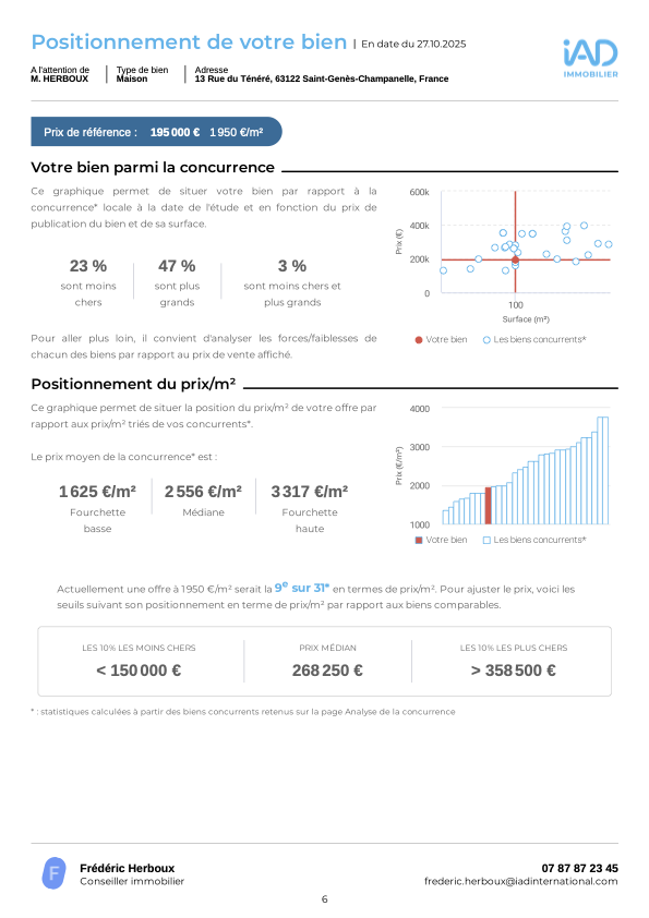 (1) Tous les conseillers iad sont des agents commerciaux indépendants de la SAS I@D France immatriculée au RSAC (sans détention de fonds), titulaire de la carte de démarchage immobilier pour le compte de la société I@D France SAS. ¨¨(2) hors temps de pause légaux. (4) Rémunération moyenne inférieure constatée sur l’année civile 2022 pour la catégorie « mise en vente de biens. » (5) OFFRE STARTER + : Offre avec obligation d’achat valable du 25 mars 2025 au 30 juin 2026 inclus – jusqu’à 6 mois à 99€HT/mois, renouvelable une seule fois dans la limite de 6 mois complémentaires selon les conditions : Modalités Starter +. (6) : Fonctionnalité produit telle que présentée valable jusqu’au 30 octobre 2024