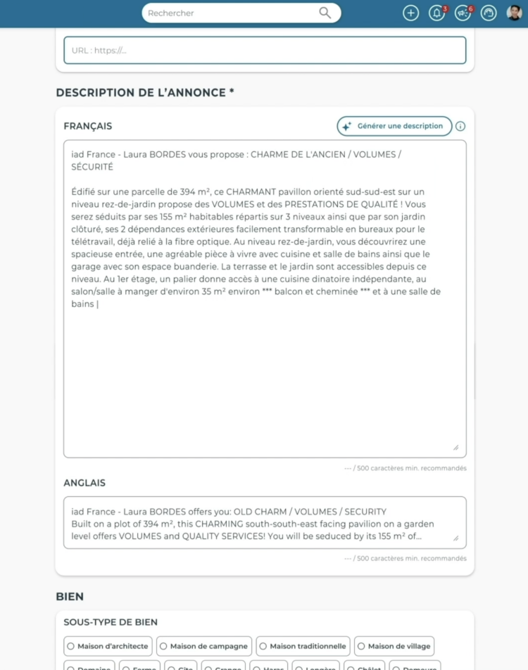 Playiad intègre la puissance de l’IA pour générer une description automatique à vos annonces en fonction des critères renseignés sur le bien.